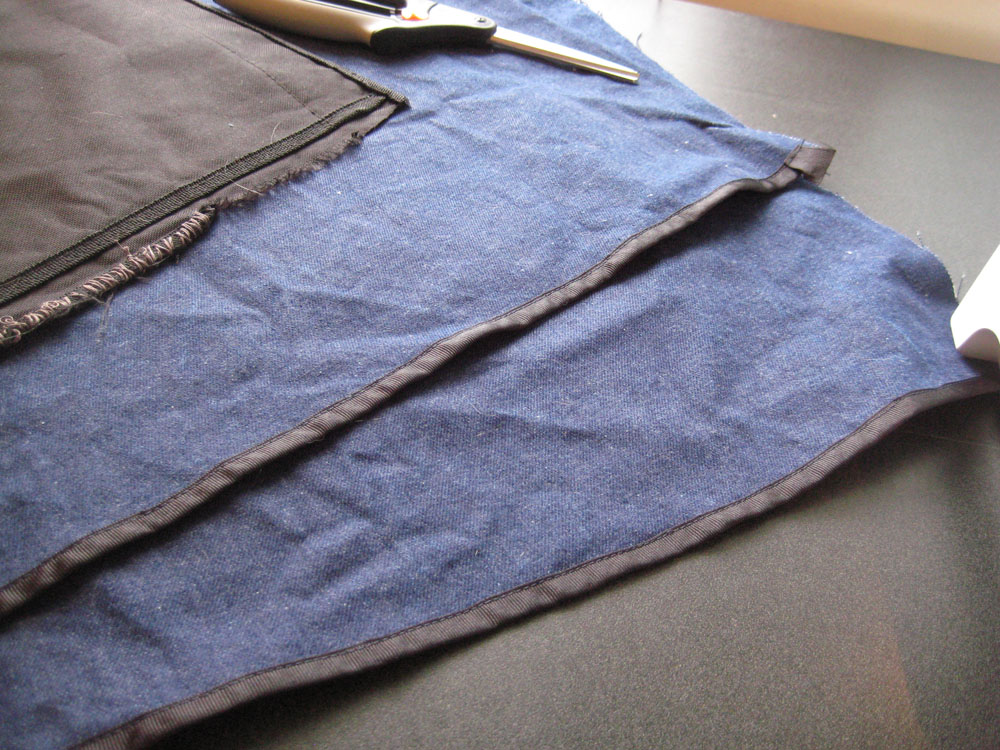 Returning to work, resigned to the only thing I could think of to fix the problem, and began be cutting off the excess from the top of the sides then ripping out the binding and resewing it on the shortened pieces.